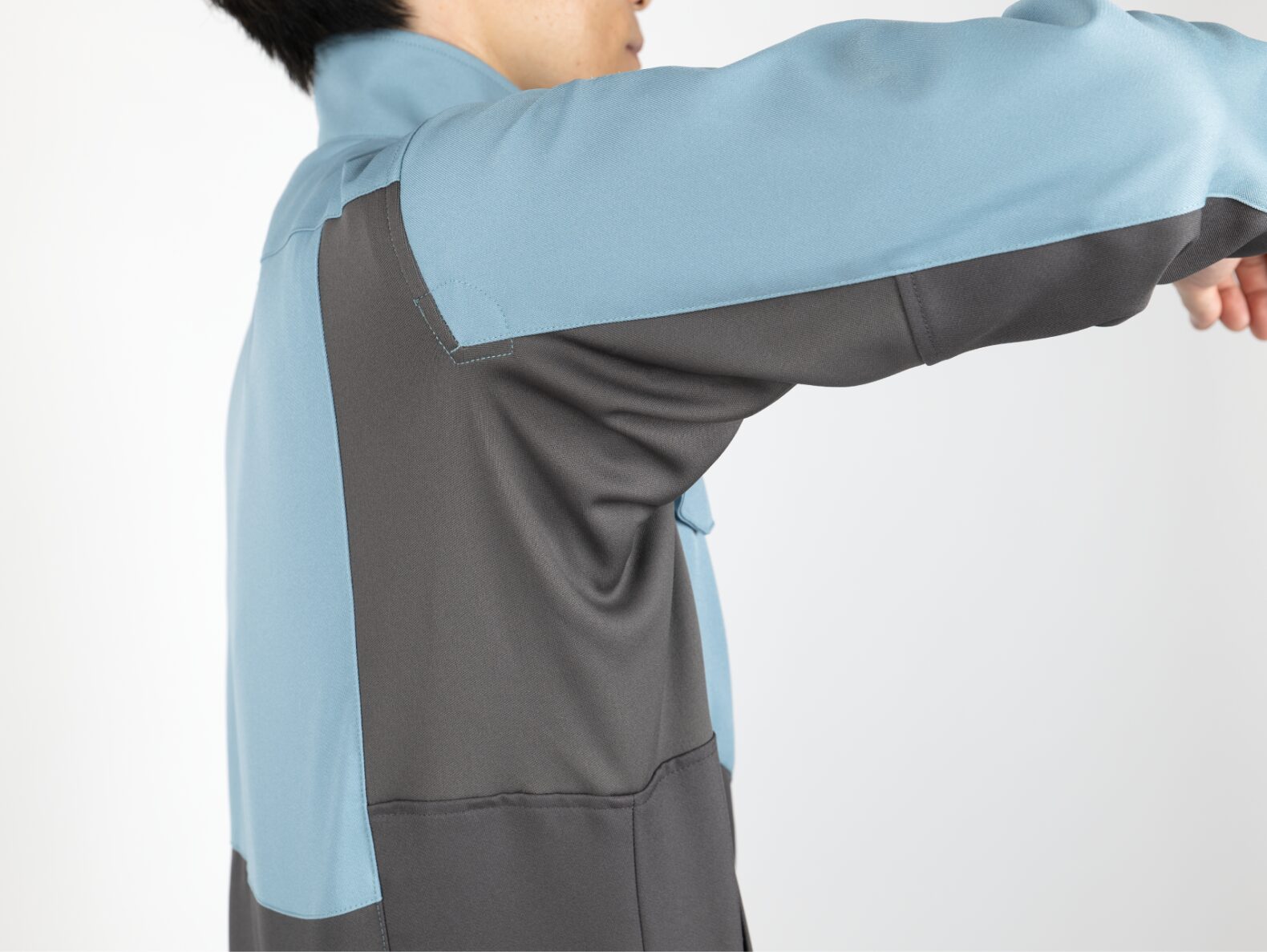 ブルゾンはフルハーネス装着時でも使いやすい縦型ポケットとし、脇や腰部分には 伸縮性のあるニット素材を採用し動きやすさを実現するHE METHOD(特許第7408126) を採用しました。