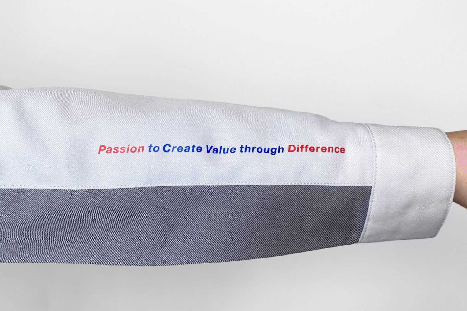 コーポレートスローガンを、いつでも見える袖口付近にプリントしました。